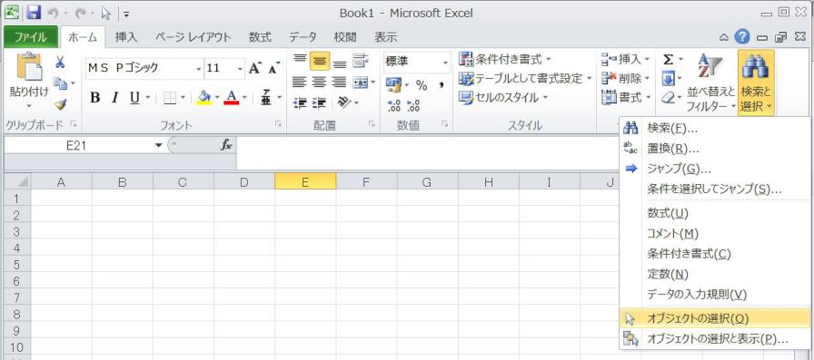リスト(アイウエオ順です)から[オブジェクトの選択]を探してクリック
