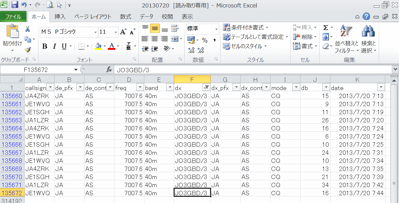 移動運用日(7月20日)の生データ(Raw Data)をダウンロードし、エクセルで自局のコールサインをフィルターしてさがしてみたら・・・ おっ、ありました!