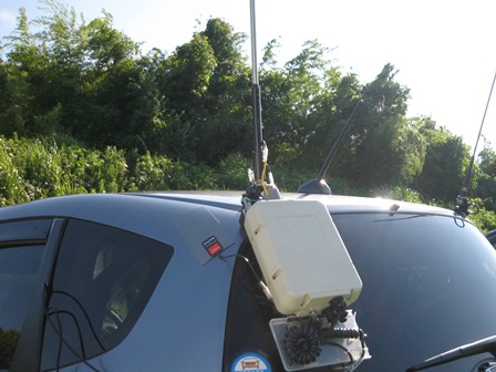 試しにエレメント配線を延長したり、ロッドアンテナを縮めたりと試しましたが効果はいまひとつ。思い切ってロッドの下に延長コイルをと一瞬思ったとことろで、今日の検討を切り上げました。暑かったし。Hi!