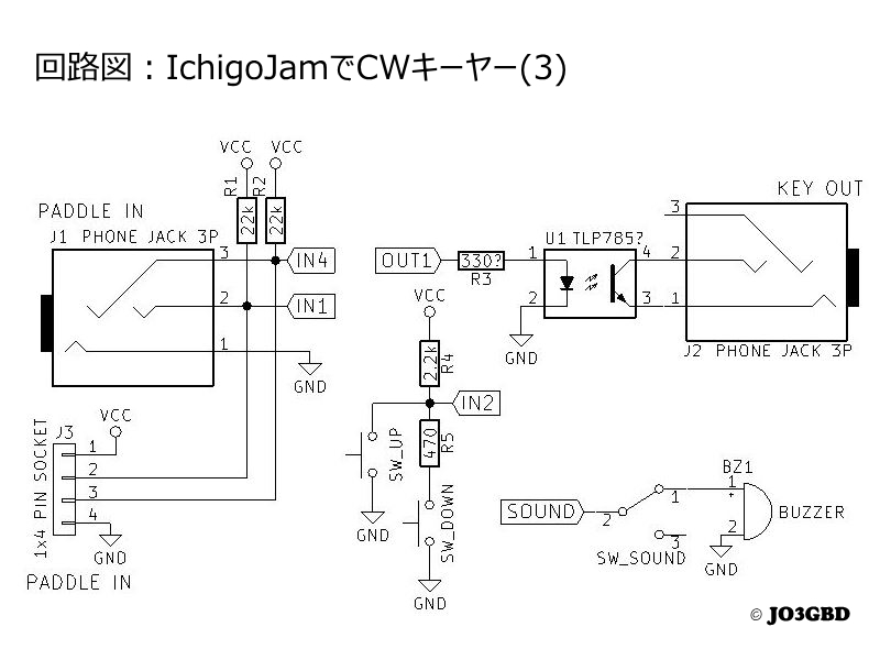 無線機のキー入力したときは、無線機からもモニター音がでるので、IchigoJamのブザー音を消せるようにスイッチ(SW_SOUND)を設けました。
