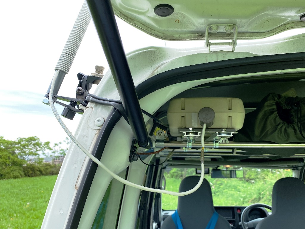 荷室の奥(リアシートあたり)からバックドア方向にAH-4のお尻を見た写真です。アースの2本はボディーとマグネットシートへ。